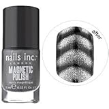 nails inc. , What it is: A revolutionary magnetic nail lacquer used to create stunning 3D nail art designs in chic metallic shades. What it does: Get the wow factor with this revolutionary polish that lets you create gorgeous nail art effects in just a few minutes using nails inc. Textured, special effects nails are big news for this season and the ultimate fashion and party accessory. Choose from three magnetic polishes named after iconic London attractions: Trafalgar Square (chrome), Houses of Parliament (purple), and Whitehall Teal (teal). What else you need to know:This unique formula has been specially developed with metallic particles to create a pattern on the nail using magnetic forces. As the magnet is held over the nail, the iron powder in the formulation gravitates toward the magnet forming the pattern secretly hidden in the magnet for an astonishing finish. The magnet is included in the cap of the nail polish.How to get the magnetic effect: -Remove any oil from your nails by cleaning your nails with nail polish remover. -Take off the over-cap that contains the magnet and set aside. -There is an inner cap that you can use to apply the magnetic polish. -Apply one coat of your selected nails inc. base coat. -Then, apply one coat of your chosen magnetic polish on all 10 nails and let dry for a few minutes. -To create the "magnetic effect," apply a generous coat of magnetic polish to one nail, and immediately hold the cap that contains the magnet over the nail. (Do this quickly while the polish is still wet. There is a small lip on the cap which should be placed just below your cuticle allowing the magnet to be positioned perfectly over your nail.) -Hold very close to the nail for 10-15 seconds, taking care not to touch the nail with the magnet. -Repeat on all 10 nails and apply a top coat to seal the design. (Read More)